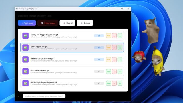 未分類デスクトップに背景透過したgif画像を配置するツール あなたのデスクトップに、動くマスコットを。作業中のデスクトップ、なんだか寂しくありませんか?Desktop Image Displayは、お気に入りの画像やGIFアニメーションをデスクトップ上に自由に配置できるツールです。かわいい猫のGIF... 2025.12.18未分類